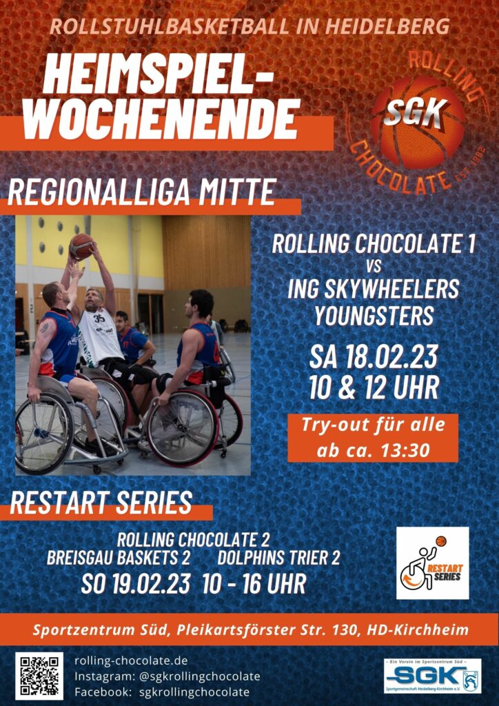 Den Teams der Rolling Chocolate aus Heidelberg steht ein ereignisreiches Wochenende bevor: Am Samstag, den 18.02.2023 spielt die erste Mannschaft der Rolling Chocolate in der Regionalliga gegen die Youngsters der Frankfurter Skywheelers. Außerdem geht für die zweite Mannschaft der Chocolates die Restart Series in die nächste Runde: Am Sonntag begrüßen die Heidelberger die zweiten Teams der Breisgau Baskets aus Freiburg und der Doneck Dolphins aus Trier. An beiden Tagen wird in der Heimhalle der Rolling Chocolates gespielt: Halle 1 des Sportzentrum Süd in Heidelberg-Kirchheim. Kommt vorbei und erlebt die Faszination des Rollstuhlbasketballs!