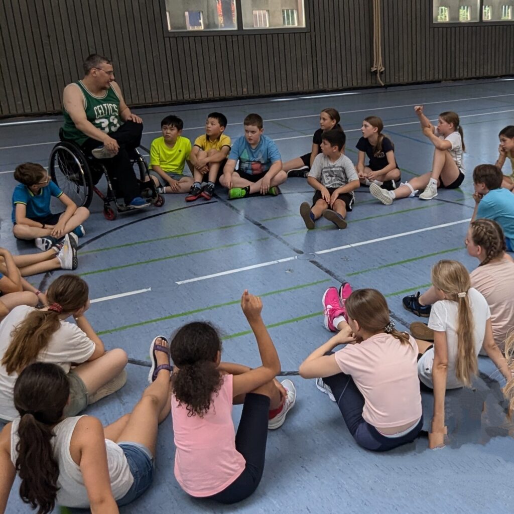 Unsere Verbindung zum Gymnasium besteht nun schon seit einiger Zeit – vor allem durch Nadjas Engagement, die die Kooperation maßgeblich mit aufgebaut hat. Mittlerweile sind wir ein fester Bestandteil des „Tag der Vielfalt“, an dem wir regelmäßig ein Rollstuhlbasketball-Try-out anbieten. Auch JJ und Nina waren dort bereits letztes Jahr brereits aktiv im Einsatz.