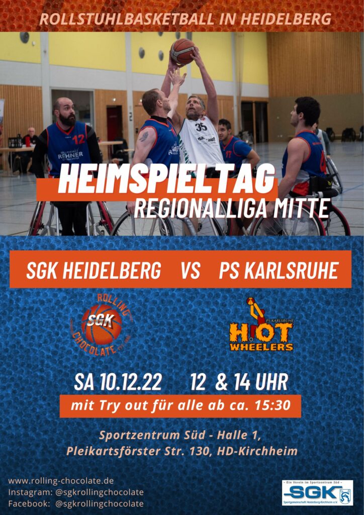 Am Samstag, den 10.12.2022 laden die Rolling Chocolate aus Heidelberg Kirchheim zum Badener Derby gegen die PS Karlsruhe. Es werden an diesem Tag, wie es aktuell üblich ist, sowohl Hin- als auch Rückspiel ausgetragen. Das erste Spiel startet um 12 Uhr mit dem Hochball, das zweite Spiel um 14 Uhr.