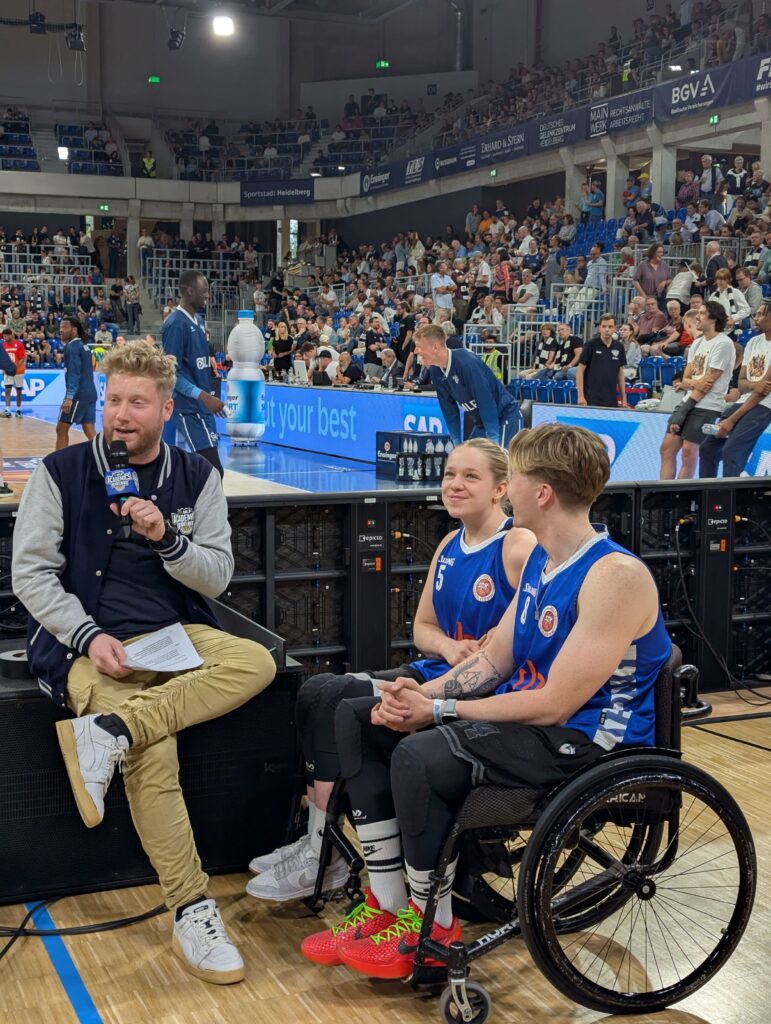 Vor der Partie gab es für Sebastian Holzheu und Franca Frey noch ein Interview bei Hallensprecher Kevin Gerwin, um die Werbung für die im Juli stattfindende Deutsche Meisterschaft der Damen im Rollstuhlbasketball zu machen.